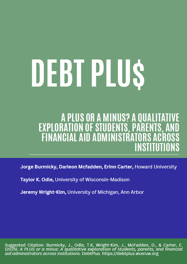 Through rigorous research that leverages student and institutional data sources, the project produces actionable insights to inform public policy and institutional practice. View work from the DebtPlu$ project, including our peer-reviewed journal articles, policy briefs, and other research products below.